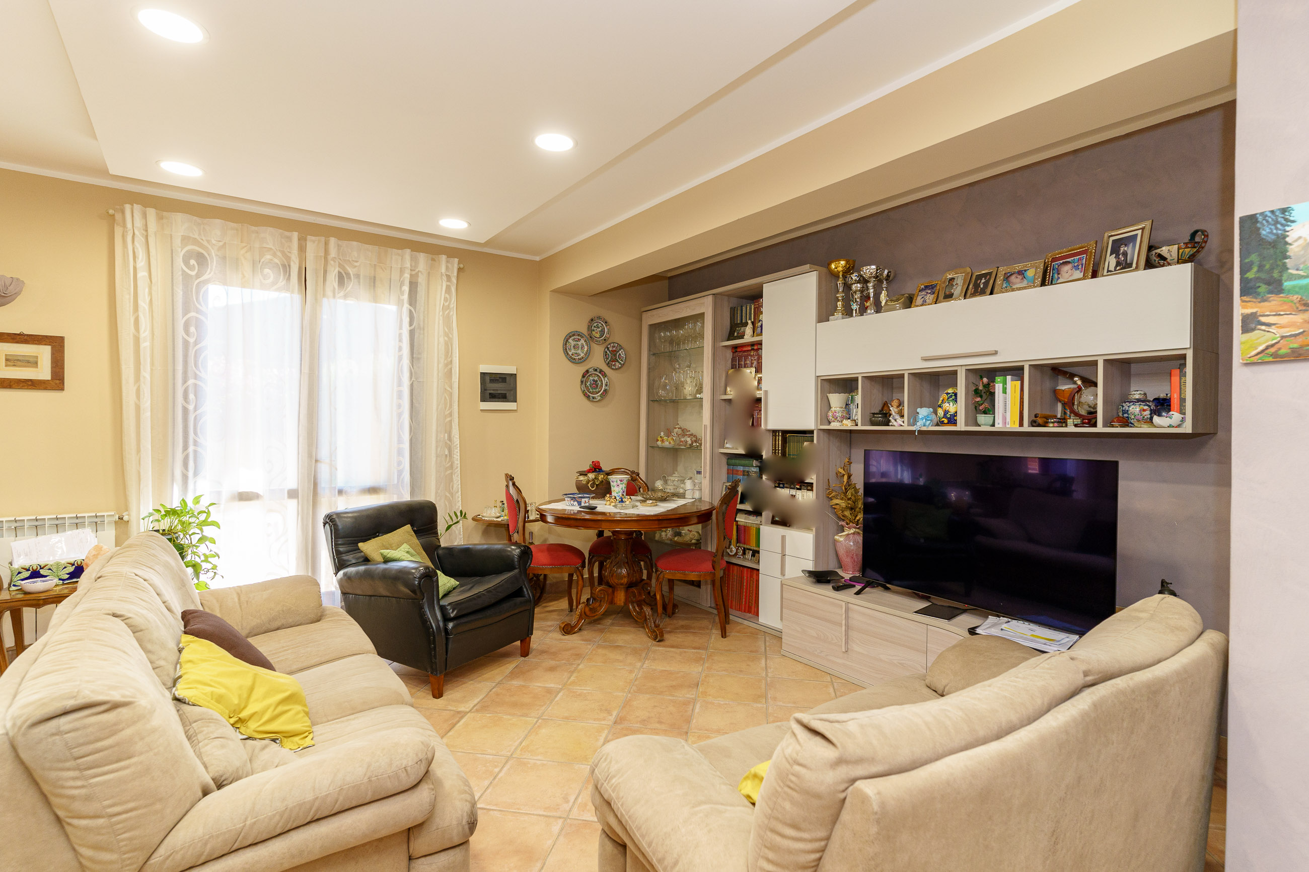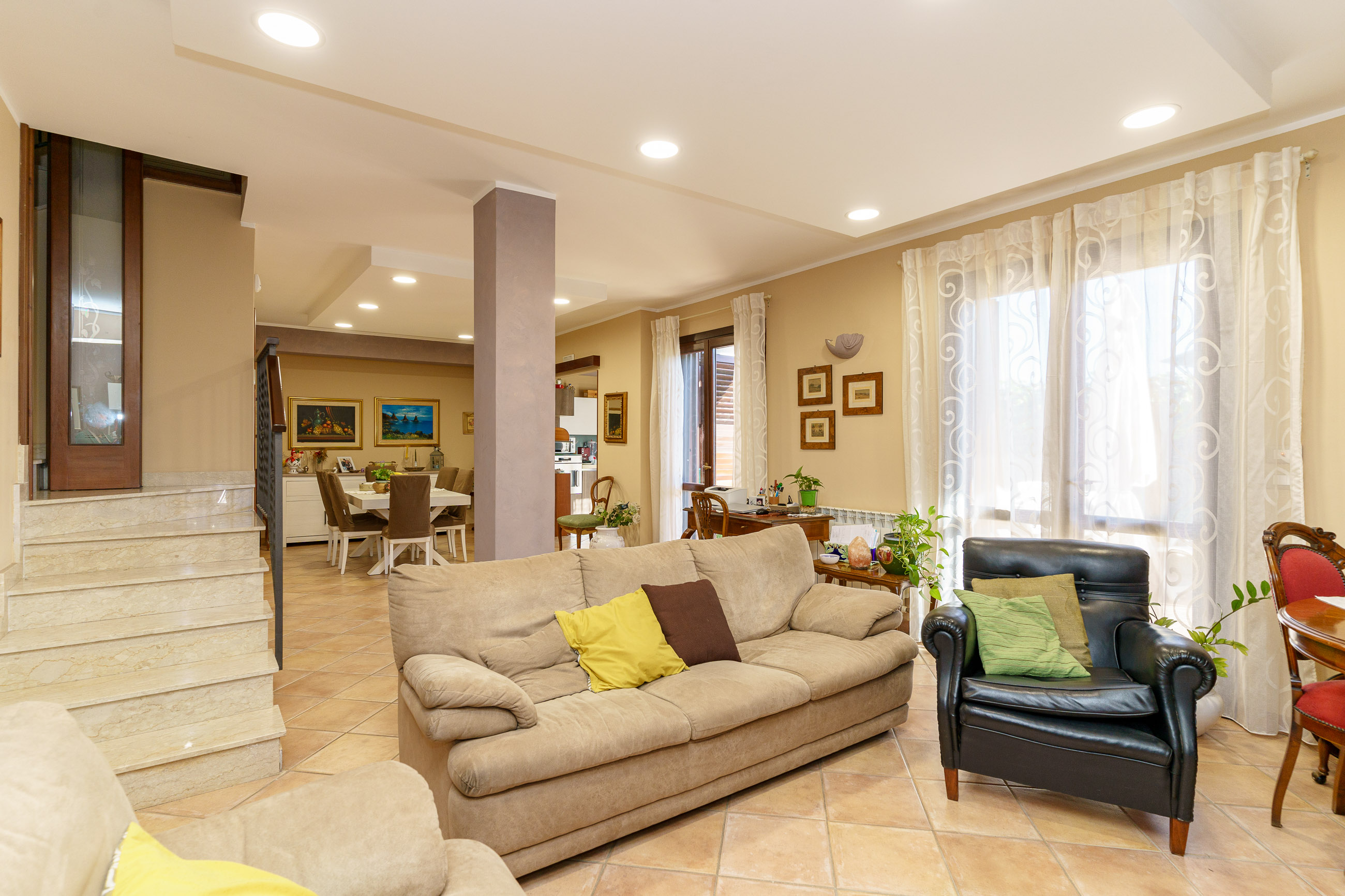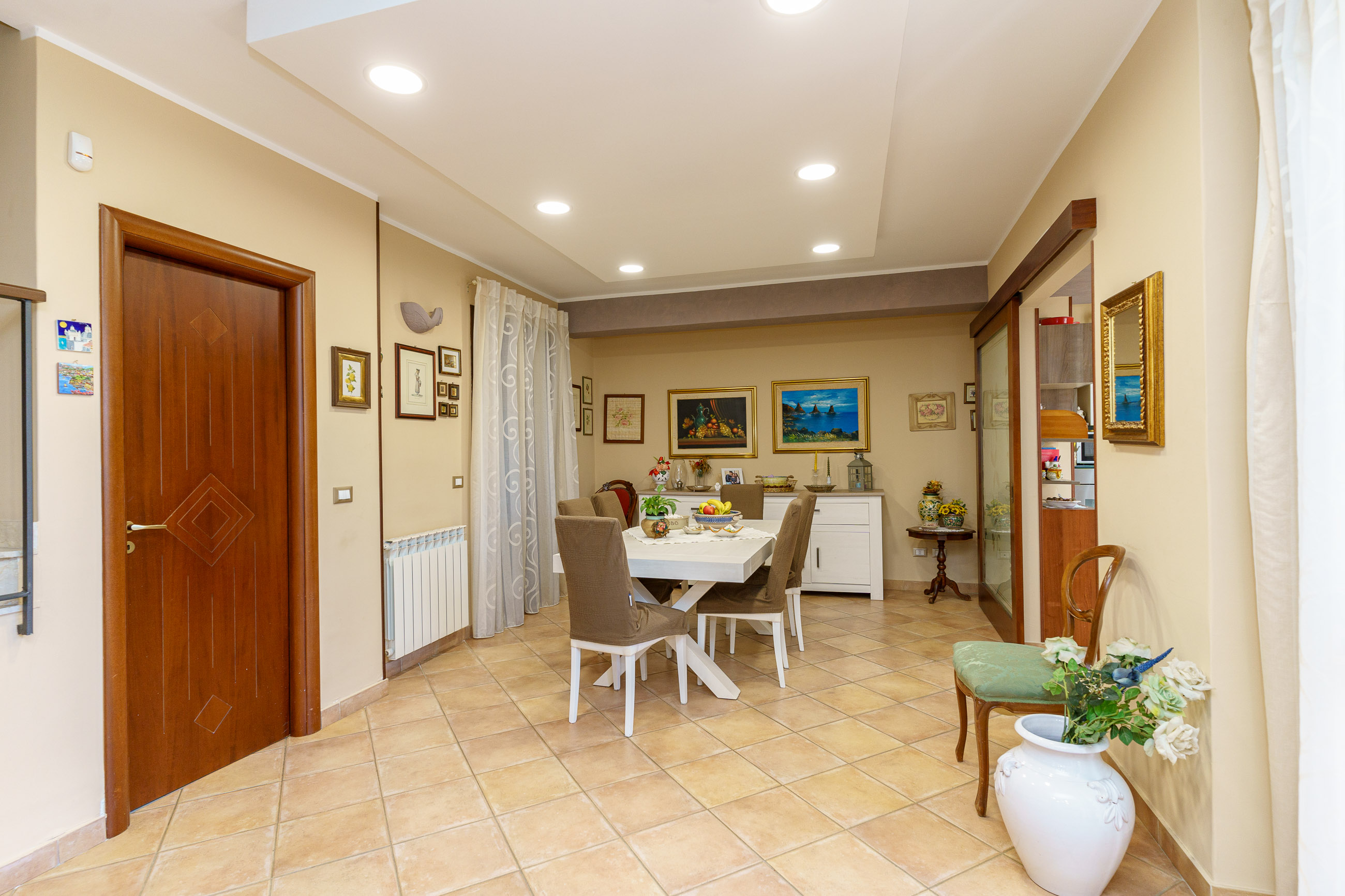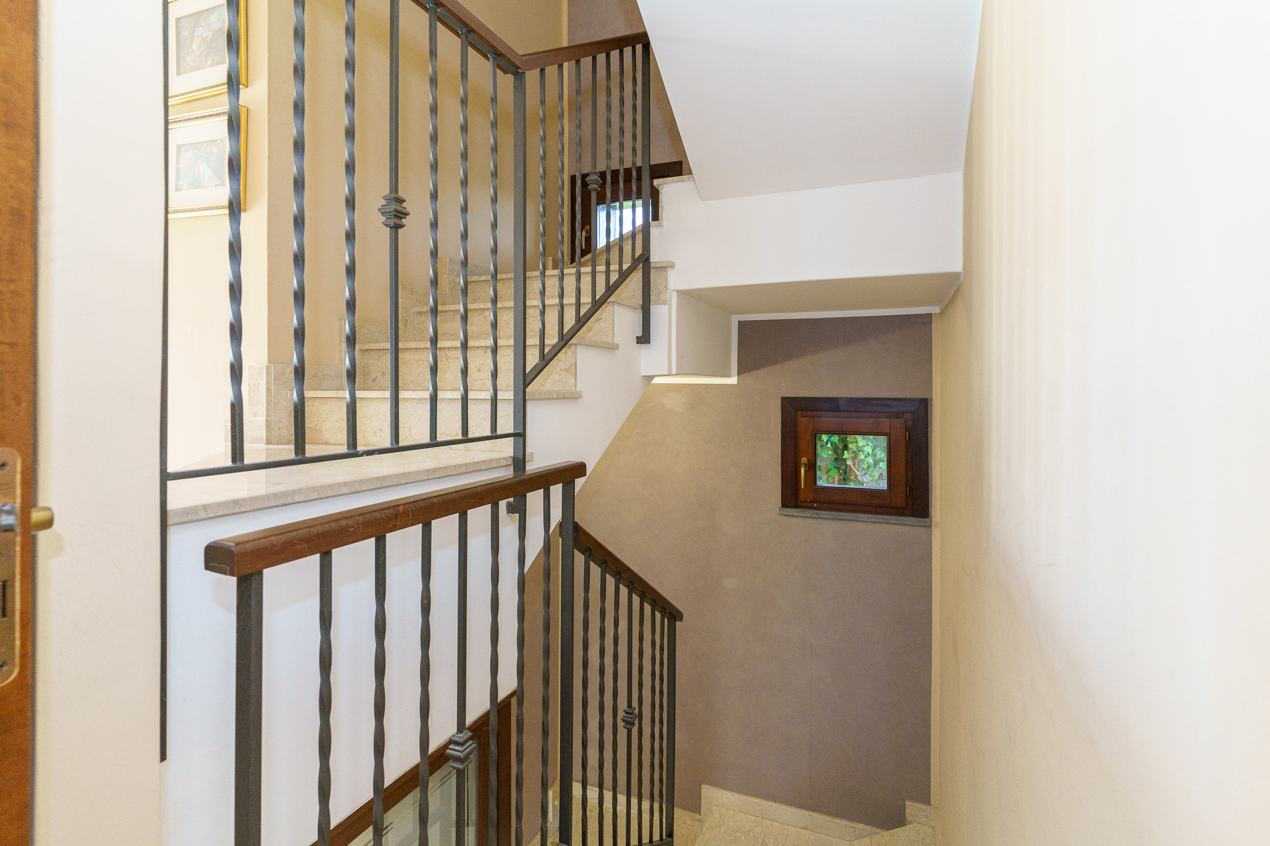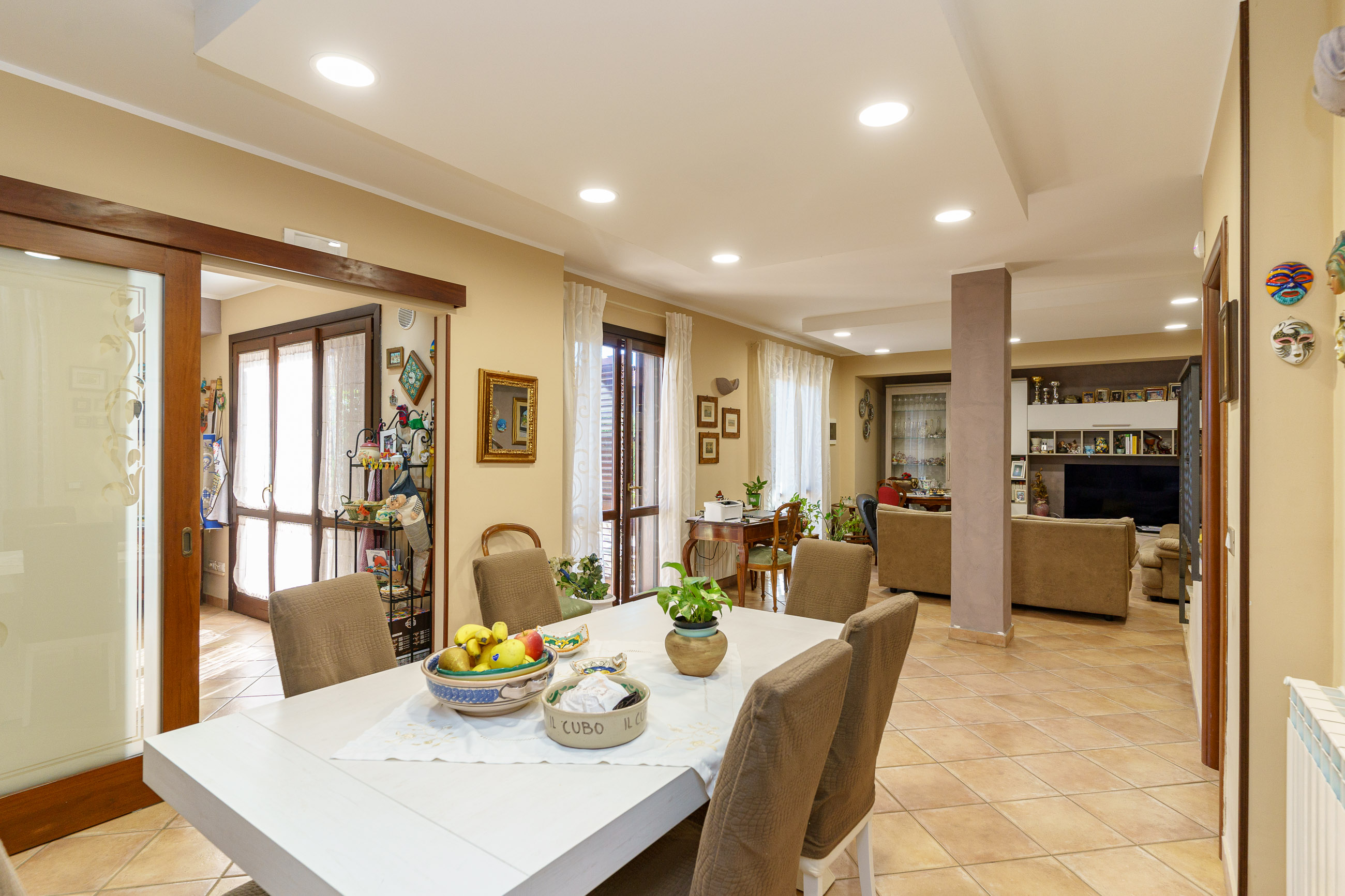 - Il Piano cantinato è composto da: bagno con doccia e lavanderia, un grande open space e cucina con penisola, suddivisi da una incantevole porta scrigno in vetro e legno elegantemente decorata.