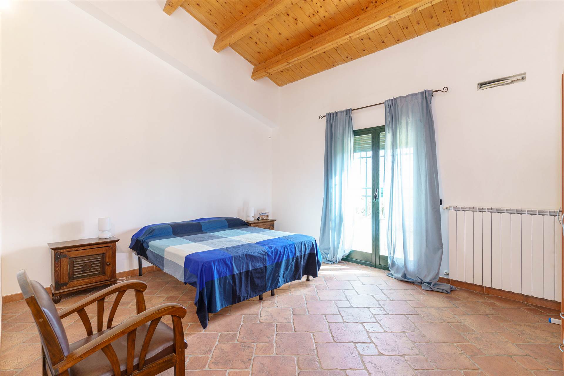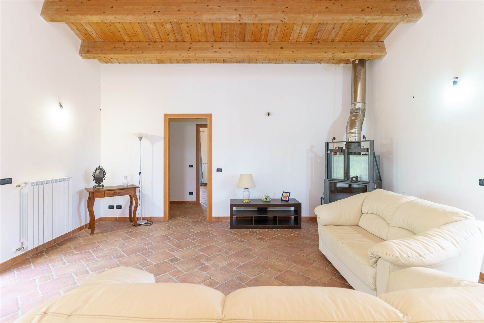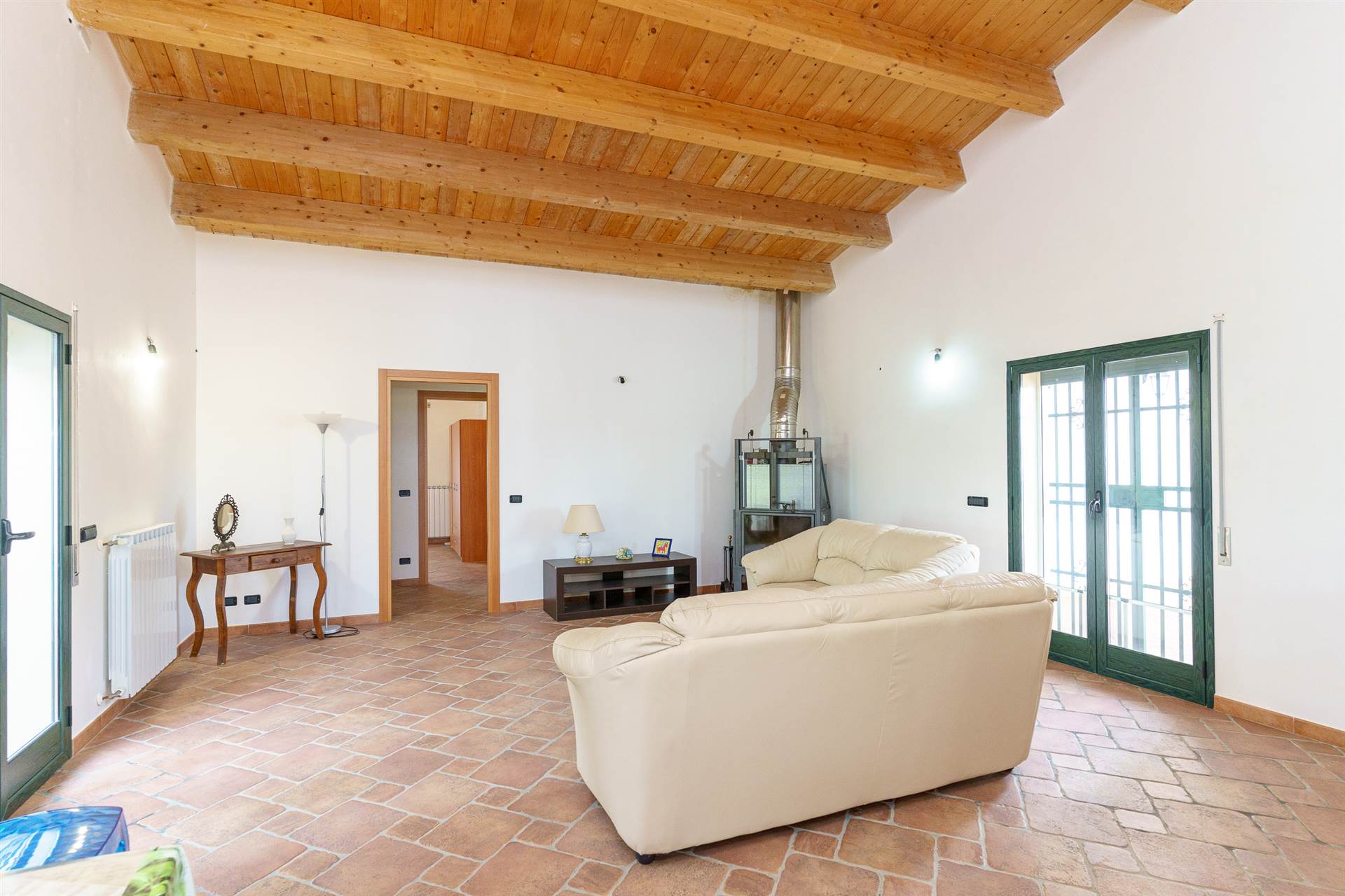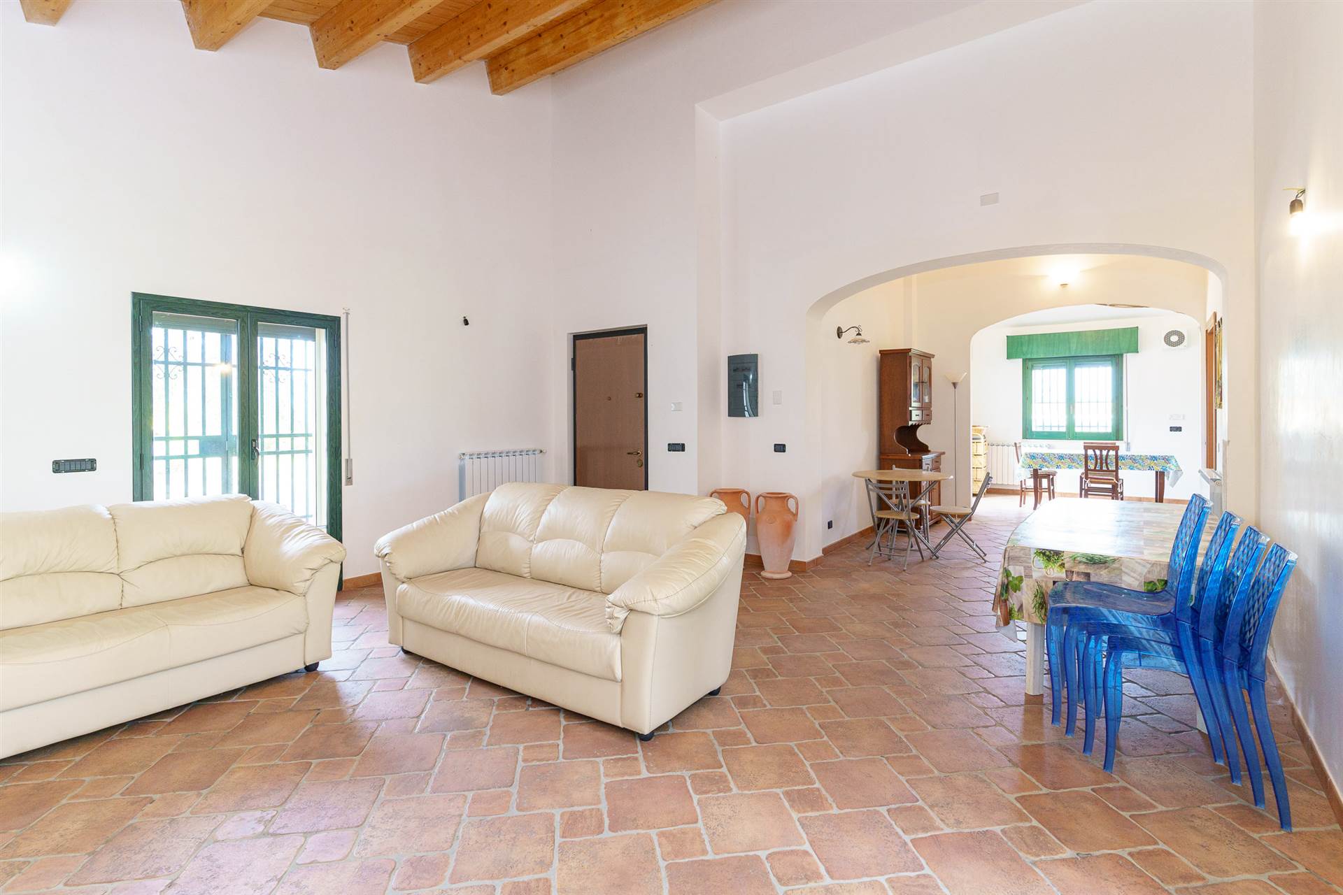 L’immobile si presenta con ottime rifiniture, infissi esterni in alluminio preverniciato e vetrocamera che esternamente sono protetti da avvolgibili e cancelli di sicurezza in ferro. I tetti sono in legno con travi a vista.