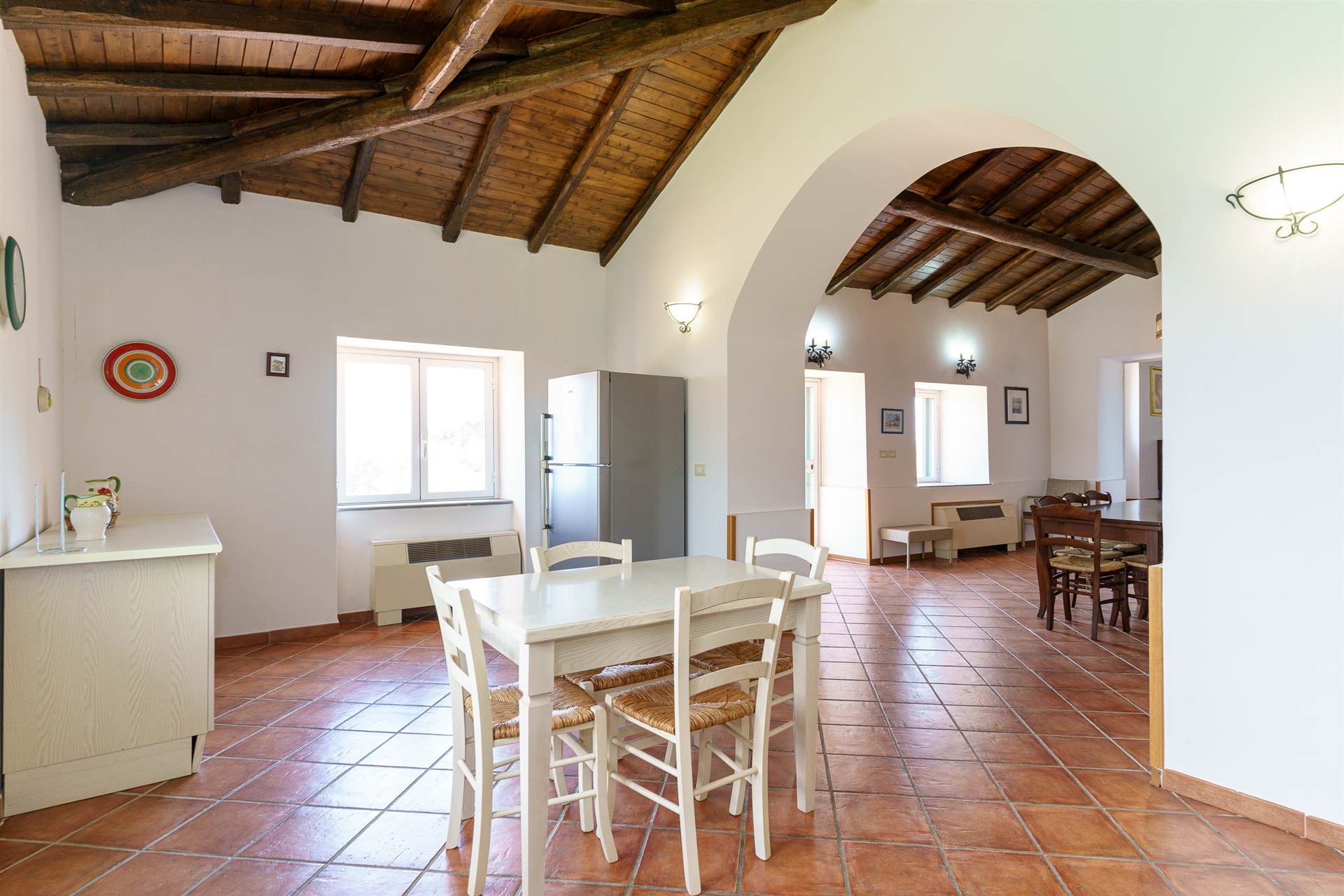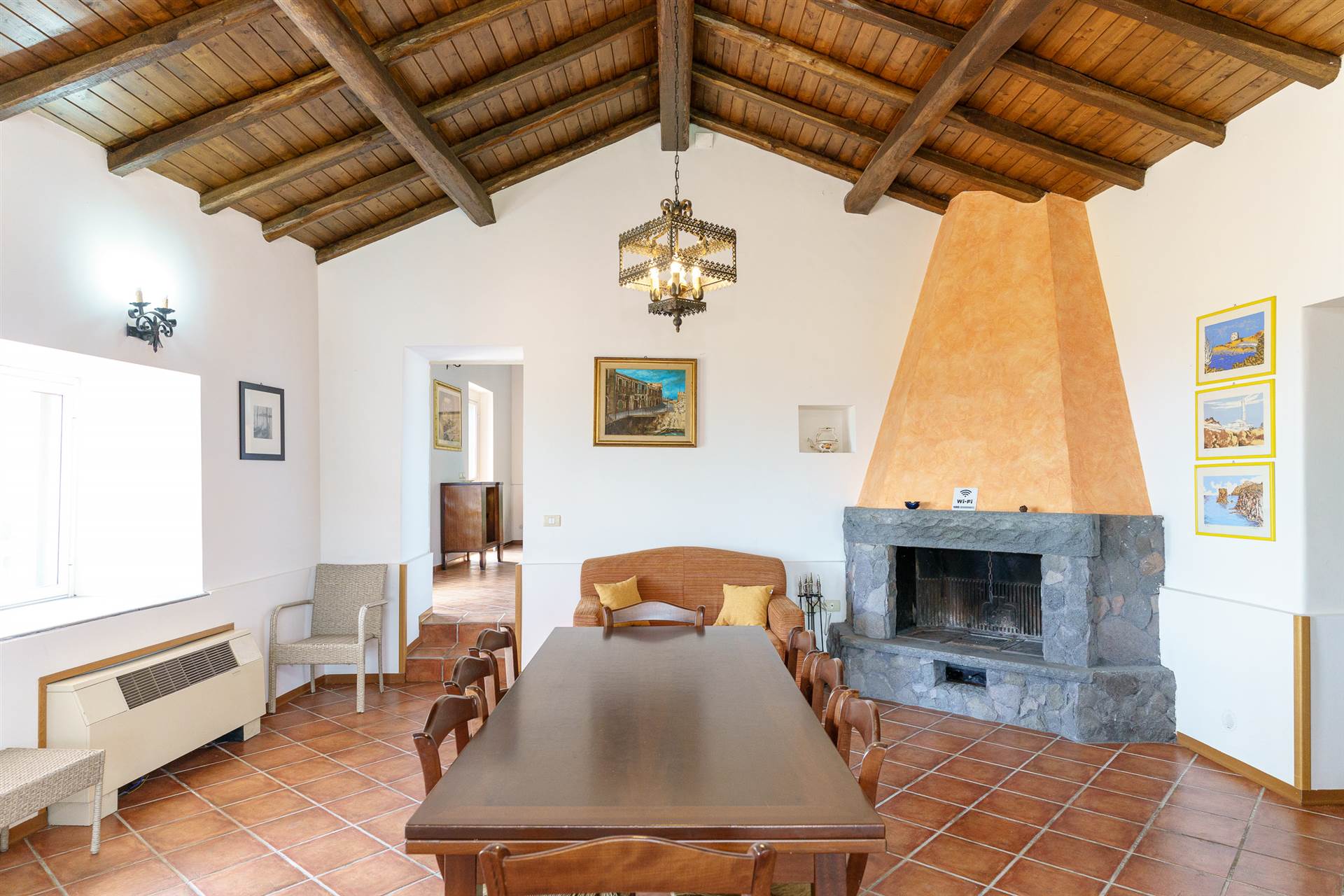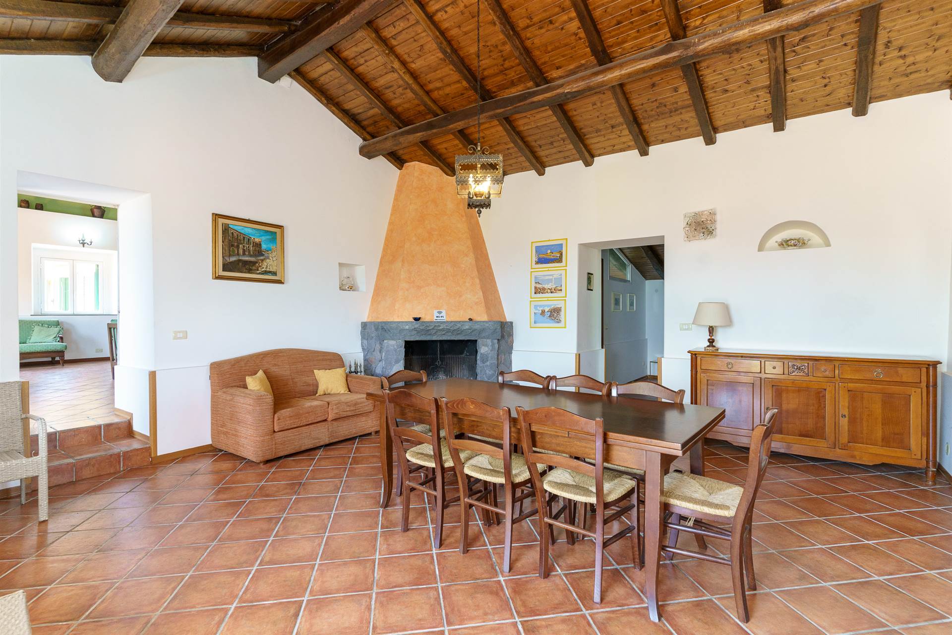 Cucina abitabile che si collega al primo salone con camino ;